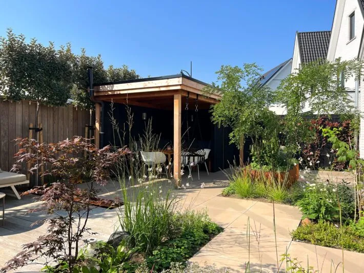 Groene tuin met overkapping en sedumdak